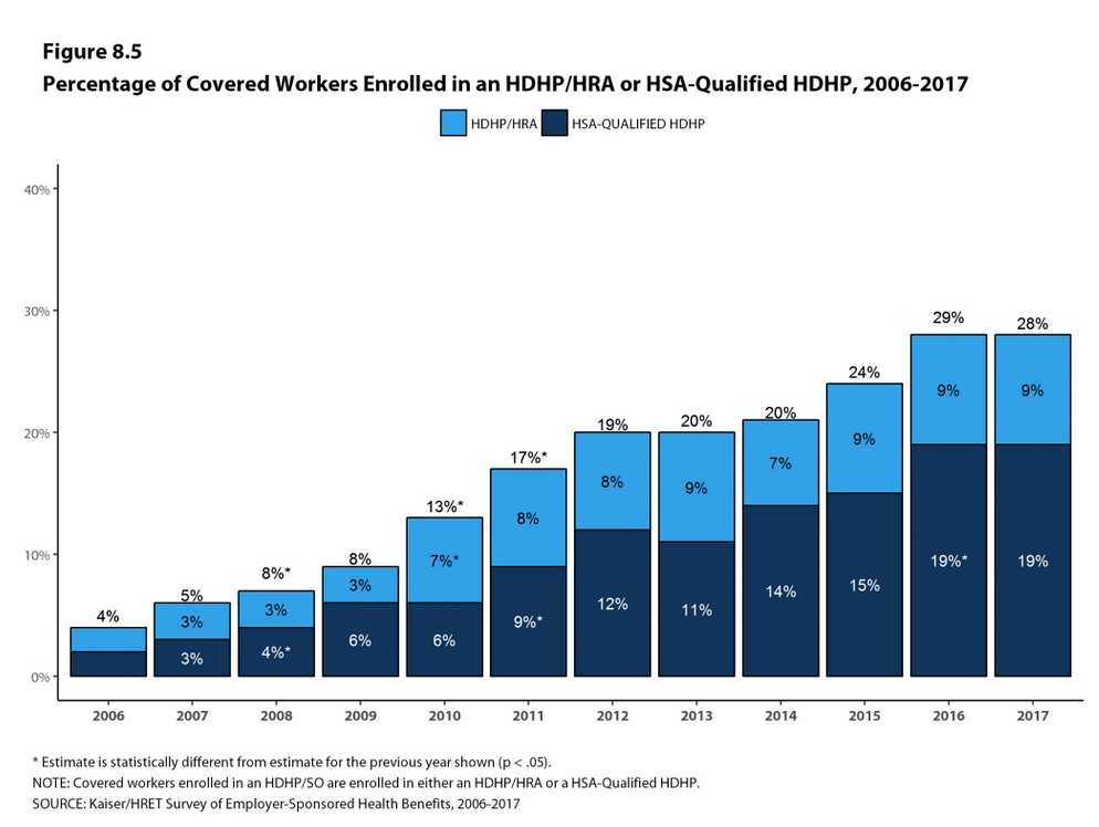 Open a Health Savings Account (HSA) through your employer and be your own CFO. HSAs are a growing trend among savvy savers who want to be in control of managing their health expenses. Kaiser Family Foundation reports that since 2006, the percentage of covered workers enrolled in an HSA-qualified HDHP has jumped from under 3 percent to nearly 20 percent in 2017.