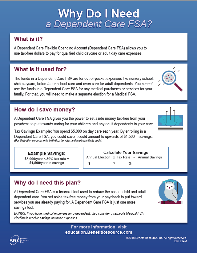 A Dependent Care Flexible Spending Account (Dependent Care FSA) allows you to use tax-free dollars to pay for qualified child daycare or adult day care expenses.