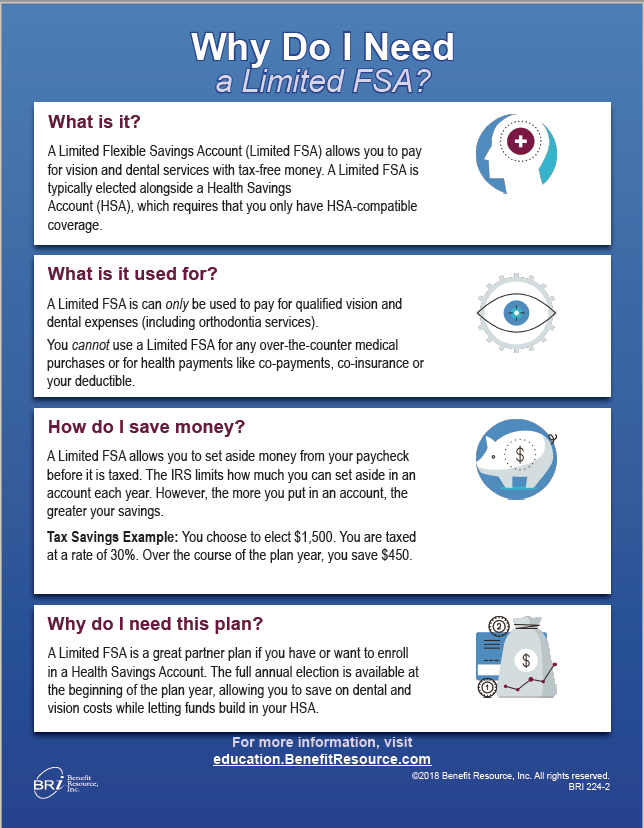 A Limited Flexible Savings Account (Limited FSA) allows you to pay for vision and dental services with tax-free money you set aside.