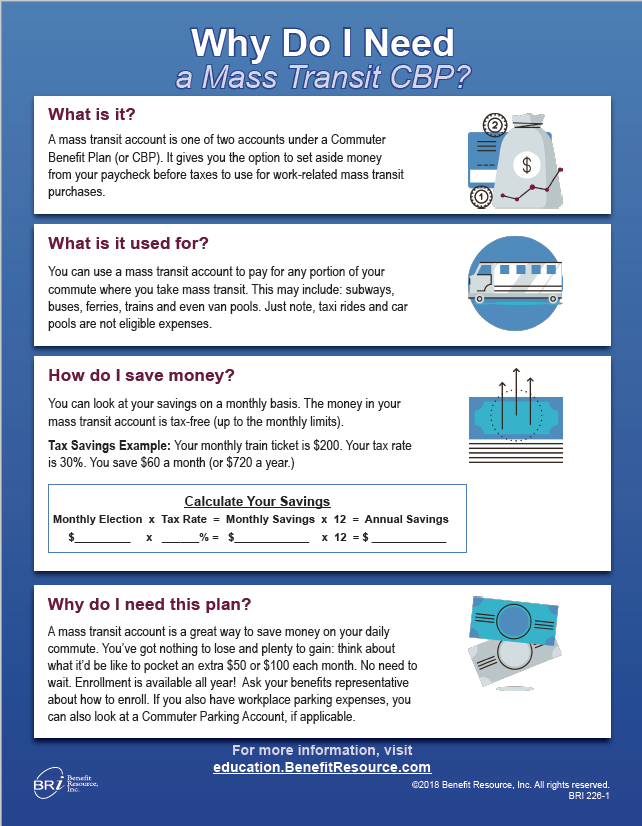 A mass transit account is one of two accounts under a Commuter Benefit Plan (or CBP). It gives you the option to set aside money from your paycheck before taxes to use for work-related mass transit purchases.