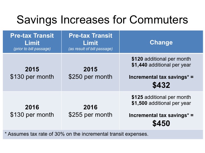 The change is retroactive for 2015. As a result, the allowable pre-tax mass transit limit for 2015 increased from $130 to $250 per month. The monthly mass transit limits for 2016 will also increase to $255 per month.In order to take advantage of the retroactive increase for 2015, participants would have needed to elect the full cost of their transit expense. Any amounts taken as a post-tax deduction can be reclassified as pre-tax up to the new limit of $250 per month for 2015 (a difference of $120 per month). Clients from Benefit Resource will receive a more detailed communication regarding options for taking advantage of the retroactive increase.