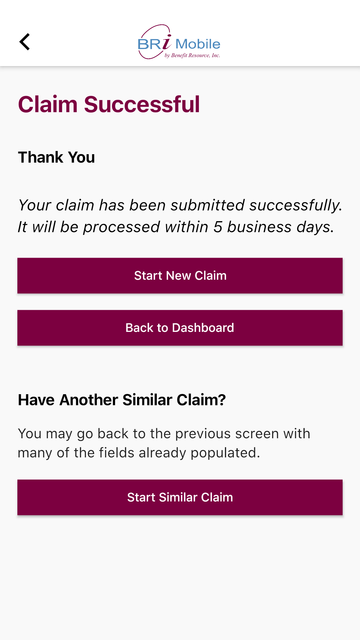 Congratulations! You have submitted a claim for your pre-tax dollars and will receive your reimbursement as soon as it’s processed! To receive your funds faster, sign-up for direct deposit through www.BRIWEB.com.