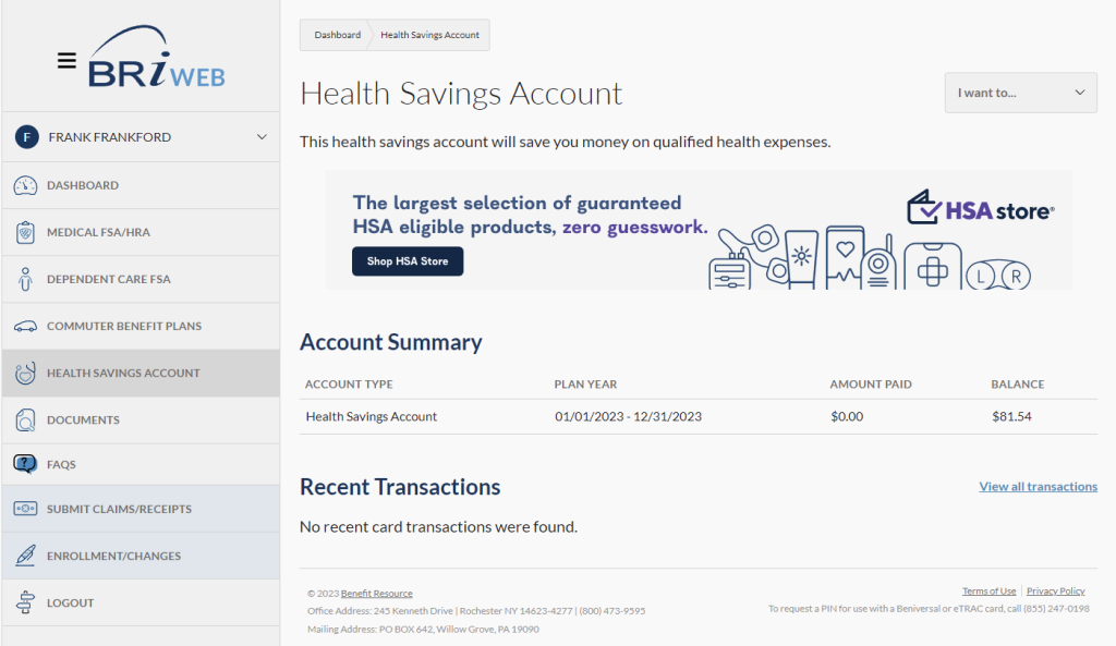 Once logged in, select the “Health Savings Account” tab from the left sidebar. There, you’ll see: