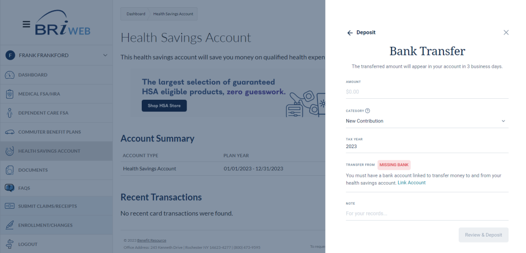 3. Return to the “Make a Deposit” screen once your bank account is linked. When scheduling your HSA rollover, you will need to enter the amount and category. If you would like to enter a note for your records, you may do so. Click “Review and Deposit.” Funds are typically moved within 2-3 business days.