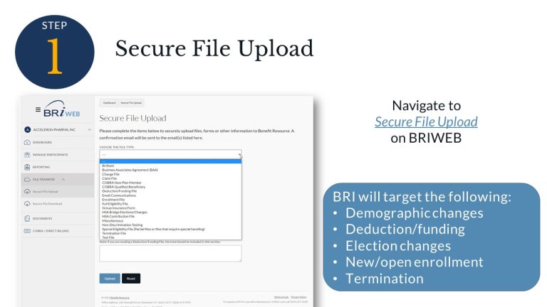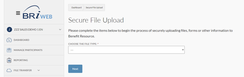 Under “File Transfer,” you can securely upload files, forms, or other information. Certain file types will take you to our BRI Import Wizard, which identifies errors and helps you get your data in the right format. See the “Import Wizard” section on this page for additional information.